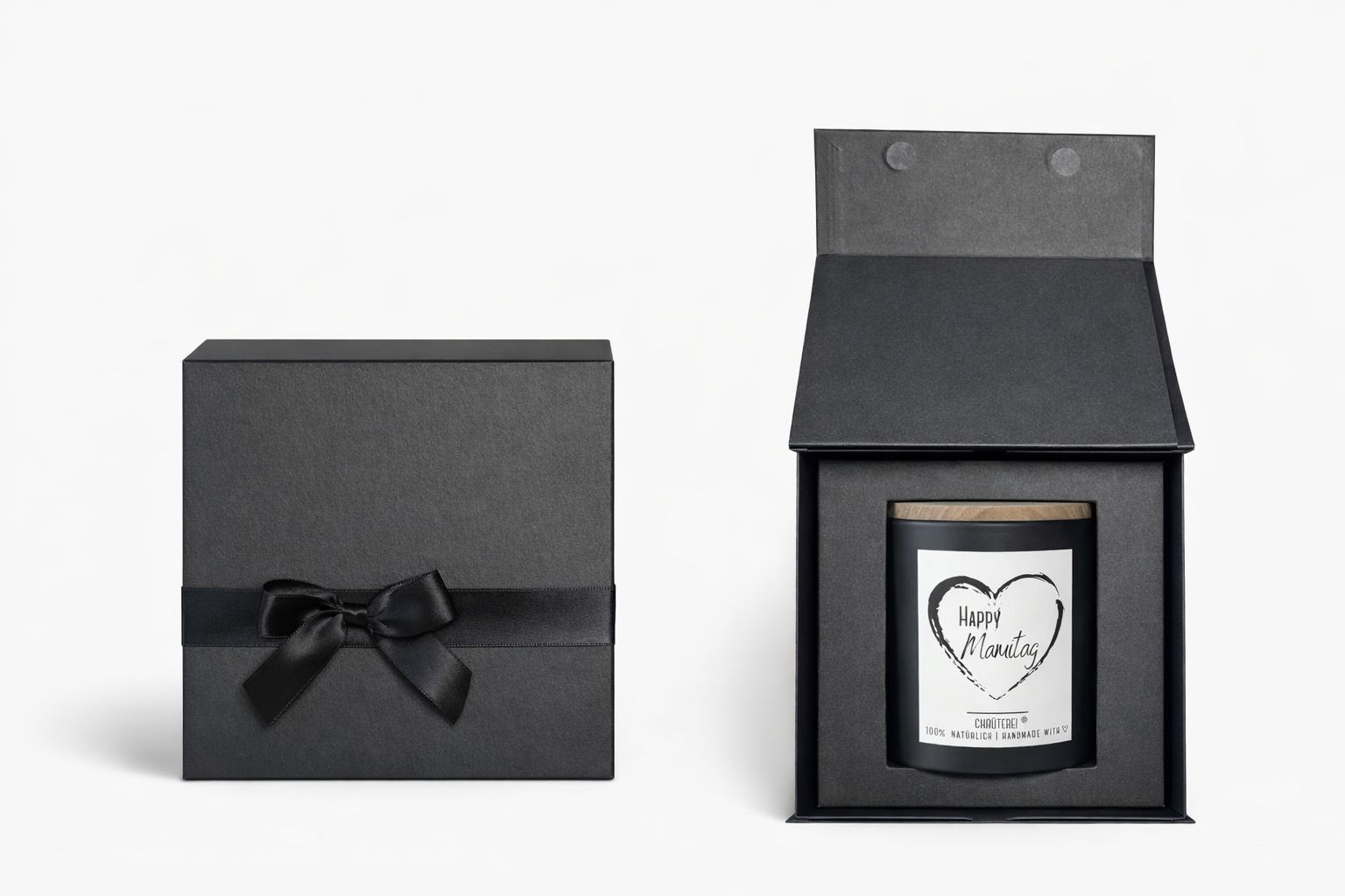 - edle, mattschwarze Geschenkverpackung mit transportsicherem, massgeschneidertem Inlay und Satin-Schleife